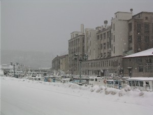 朝ごはんの時にはちらほらと舞っていた雪が、かなりはげしくなってきた。小樽到着時は本降り。寒!!